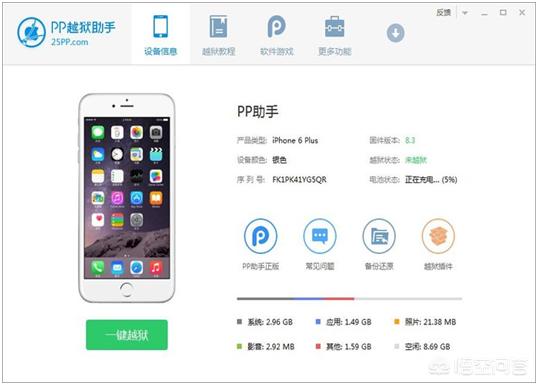 4、打开越狱助手,然后用USB数据线把苹果手机连接电脑。