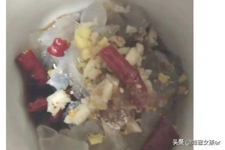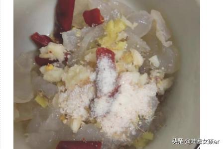 5、此时在放入葱姜蒜,食盐等调料,与海蜇丝进行腌制。