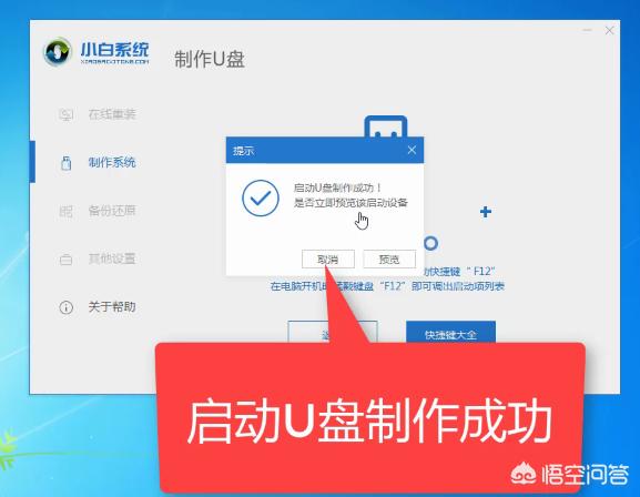 8、U盘启动盘制作完成后会出现成功的提示,点击取消