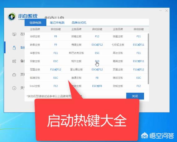 10、如图,我们可以看到不同品牌的主板、笔记本、台式机的启动热键,找到对应的要重装系统电脑启动热键,将其记下