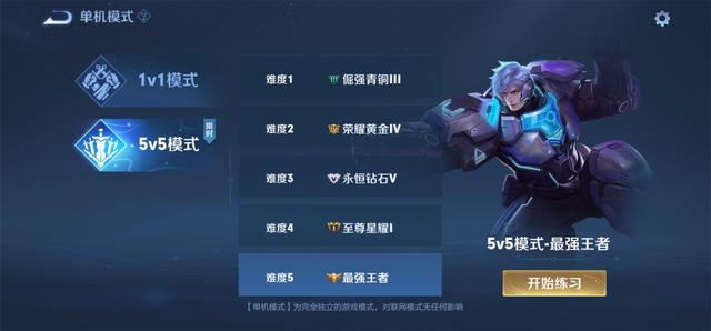 进入游戏,在主页面右上角有离线5v5的标识,点击进入后就可以选择模式进行游戏了