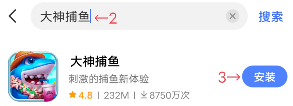 在搜索栏输入“大神捕鱼”,点击“搜索”再点击“安装”即可。