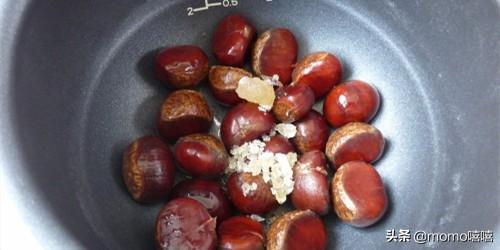 3.把栗子放电饭锅内,下冰糖与盐。