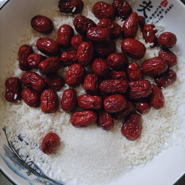 第2步、糯米、红枣洗净沥干水分糯米内放两三勺白糖拌匀【糯米泡水后更湿软,不泡水更Q弹,我没有泡水】。