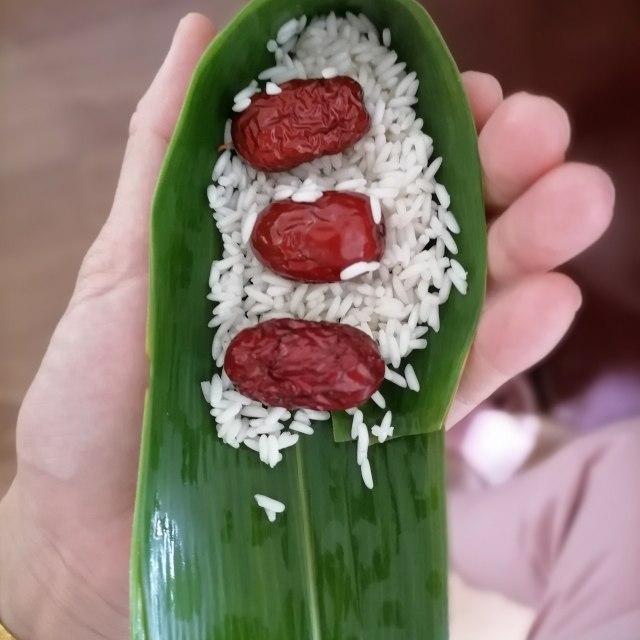 第7步、在糯米上铺上2-3颗红枣【如果粽叶够大就多铺,粽叶小就少铺】。