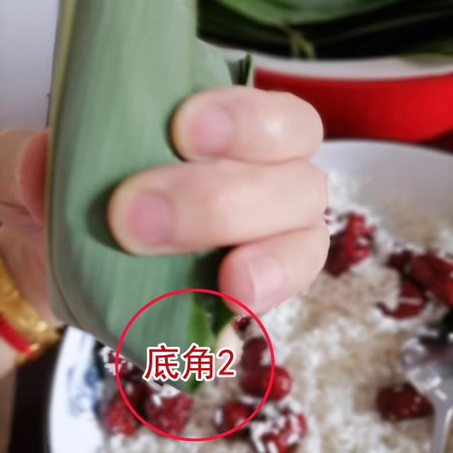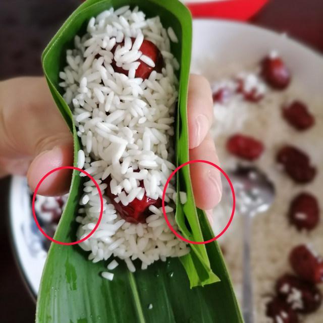 第9步、糯米不要铺太满,8-9分满即可,主要还需看粽叶的大小而定,铺好糯米后我们就要准备盖帽子,注意图上两圆圈部位,这个部位是盖帽子的起折点。
