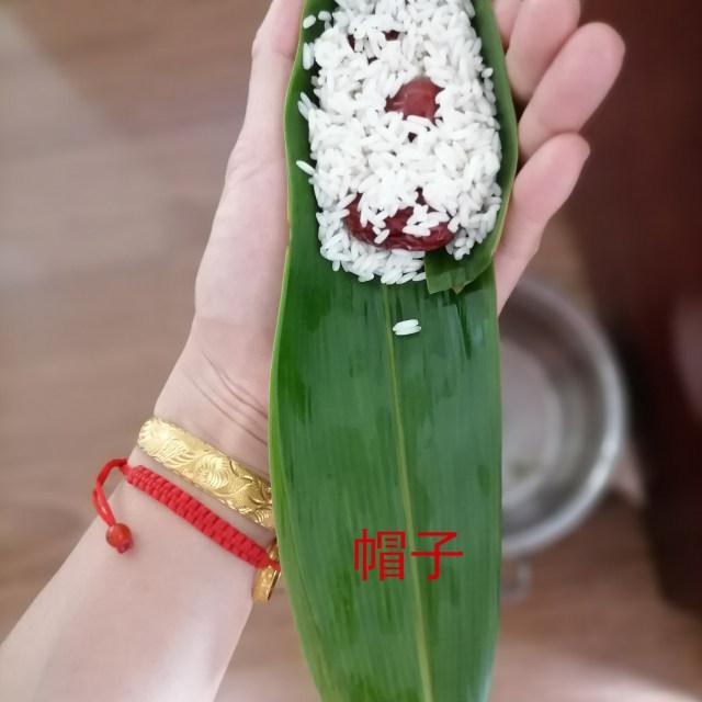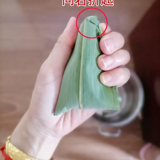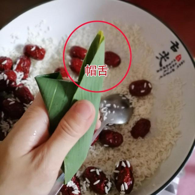 第15步、手握粽子,帽舌从右侧平齐贴紧粽身然后用手抓牢粽子,全部操作完后下一步就是缠粽绳。