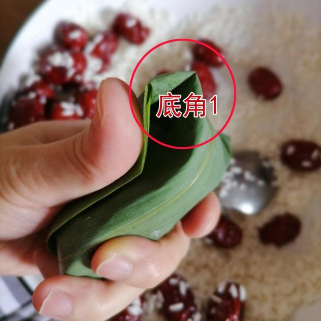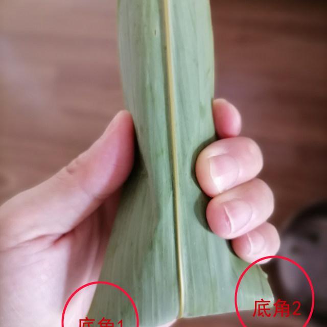 第4步、在粽叶的一端,差不多三分一处窝一个小角,这个角是为我们准备折漏斗准备的防漏内角。
