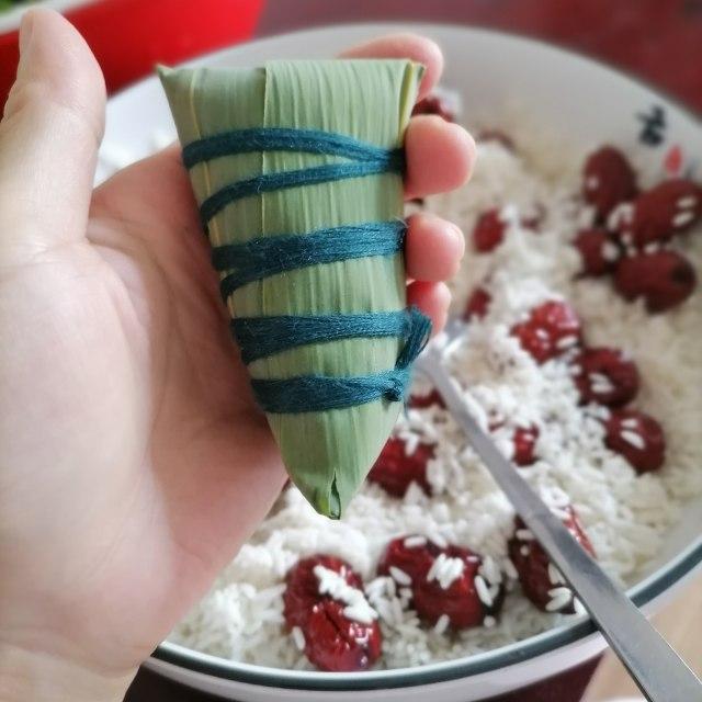 第16步、抓紧粽子,从一端开始一圈圈的缠绕到另一端系紧即可,也叫埋线缠绕。