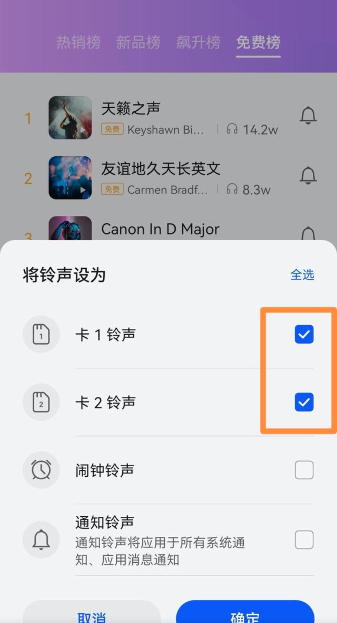 勾选要应用此铃声的手机卡,并点击确定即可。