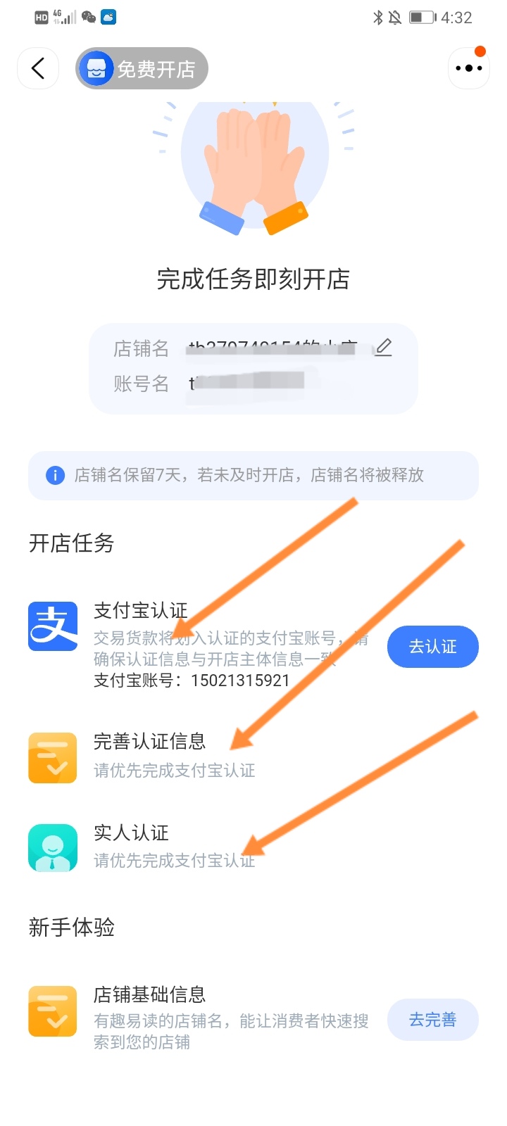 进入新页面中完成各项实名认证,包含身份证信息,联系方式,地址等。最后就是店铺装修及开始营业。