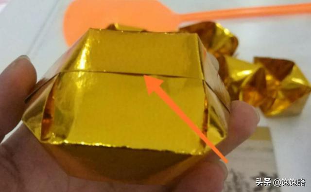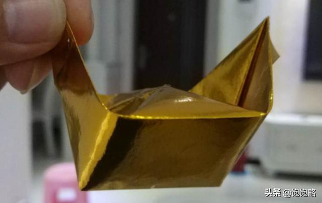 7、从元宝的下边撑开,同时调整下两个尖角,完成一个逼真元宝的折纸。